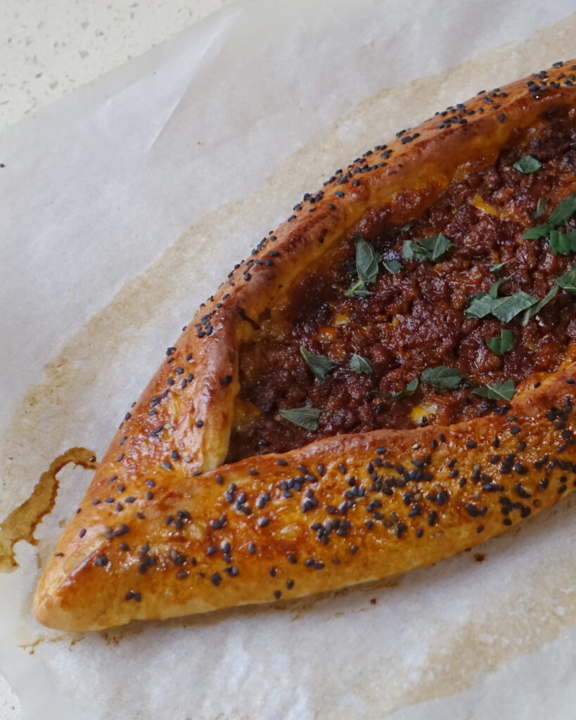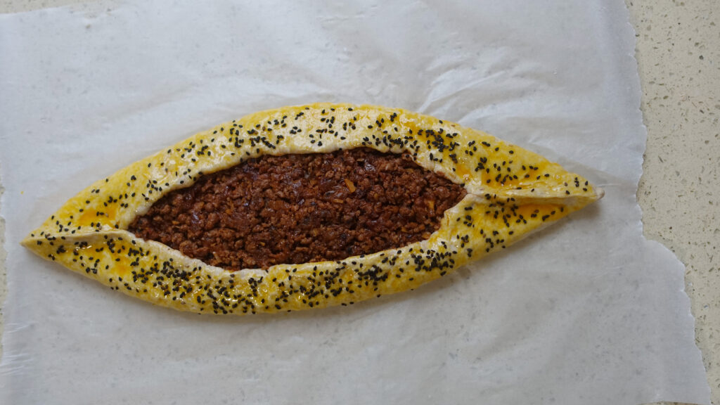 这时面团也差不多醒发到位。接着把面团擀成长椭圆形,中间铺一层芝士碎,再盖一层炒好的牛肉馅。将边缘面皮向中心折叠,整理成船形。饼皮边缘刷鸡蛋液,铺撒芝麻。