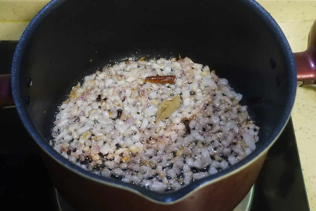 洋葱、番茄分别切碎丁。先中火煎洋葱释出香气,洋葱丁脱水发黄时,放入适量香叶、桂皮、丁香,再煎一会儿,直到洋葱呈棕色,放入番茄丁,继续熬。当番茄和洋葱变成细茸,不分你我时,来勺番茄膏,增鲜添浓。