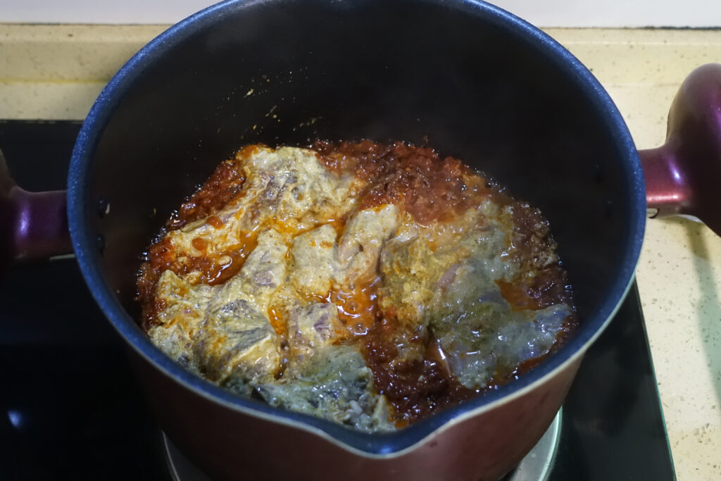 当油分离时,裹满酱料的羊排也能下锅煎了。接着加热水没过羊排,转小火炖煮约两小时。