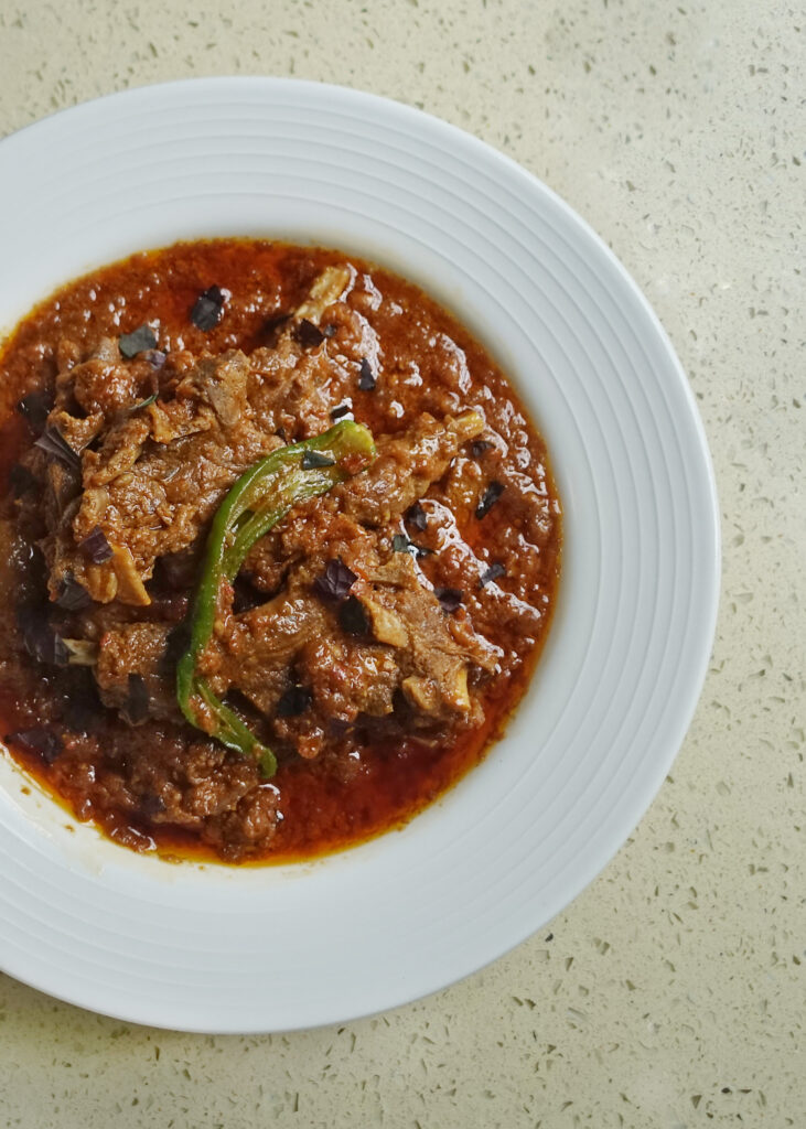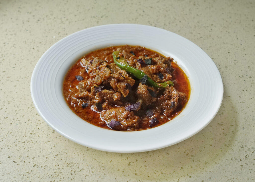 烹饪时,香气扑鼻。一盘菜,除了羊排形态完整,其余食材都熬化了,并且挂糊在羊排上。与淀粉水勾芡的黏糊质感不同,咖喱的浓稠采用果仁、奶制品、番茄……诸多不同食材长时间熬煮,在文火和时间的催化下,使淀粉、蛋白质、油脂、果胶浑融成糊状,与香料融会贯通。风味质地因咖喱品系不同,食材搭配富于变化。
